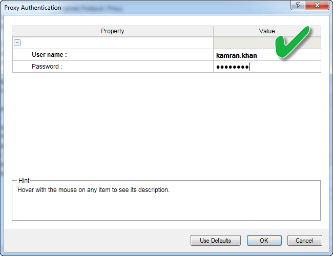 使用此屏幕提供用户名和密码以在代理服务器上进行身份验证。单击“确定”关闭屏幕。