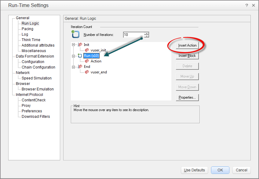 运行逻辑定义了除vuser_init和vuser_end之外所有动作的执行次数。
