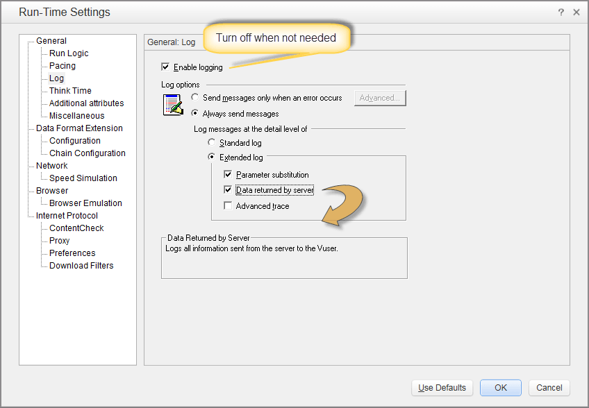 LoadRunner 提供了强大的日志记录机制,该机制本身就健壮且可扩展。它允许您只保留“标准日志”或详细、可配置的扩展日志,或者完全禁用它。