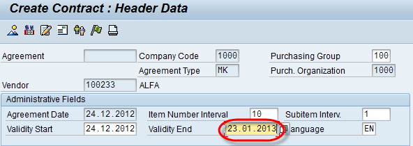 步骤 2) 在抬头数据屏幕中输入合同有效期结束日期。