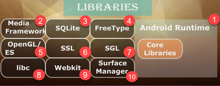 - Android 运行时和核心库使用低级语言以及针对移动设备的优化。这确保了应用程序开发者编写的代码即使在 Android 设备受限的情况下也能流畅运行。