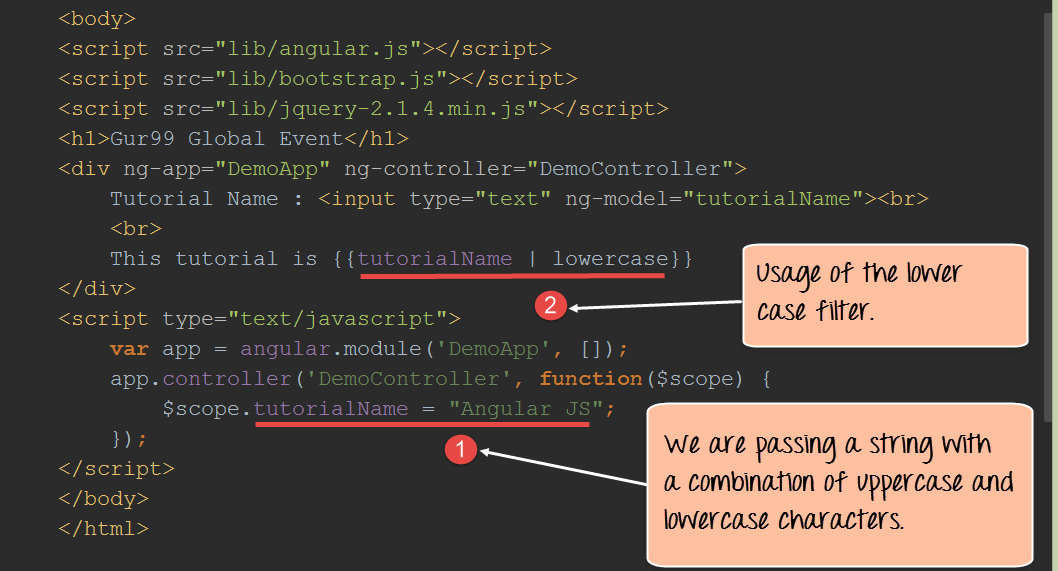 在下面的示例中,我们将使用控制器通过作用域对象将一个字符串发送到视图。然后,我们将在视图中使用过滤器将字符串转换为小写。