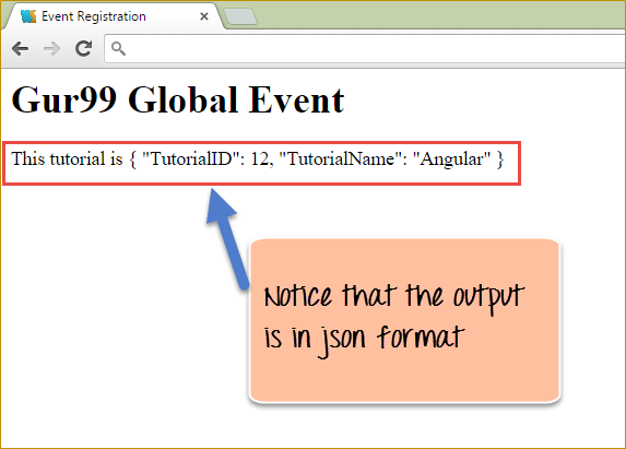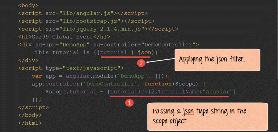 - 这里我们通过一个名为“tutorial”的成员变量传递一个数字,并将其附加到作用域对象。此成员变量包含一个 JSON 类型字符串:教程 ID:12,教程名称:“Angular”。