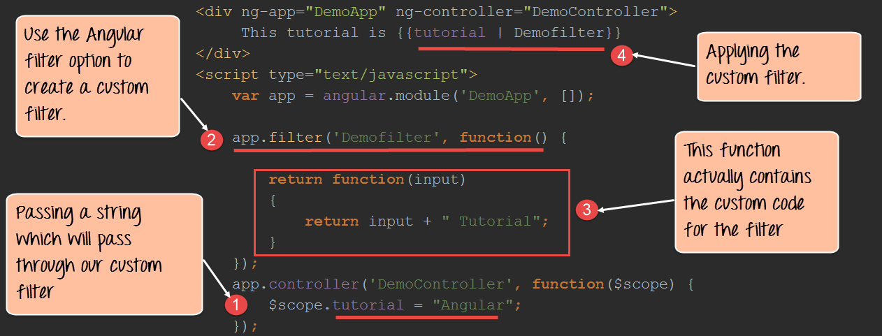 - 这是 AngularJS 中定义自定义过滤器的标准方式,其中返回一个函数。这个函数包含了创建自定义过滤器的自定义代码。在我们的函数中,我们接受一个从视图传递到过滤器的字符串“Angular”,并向其追加字符串“Tutorial”。