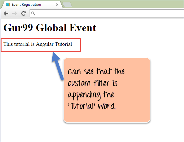 我们希望确保每次显示字符串时,我们都会在 AngularJS 中使用自定义过滤器,该过滤器将附加另一个字符串并将完成的字符串显示给用户。