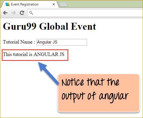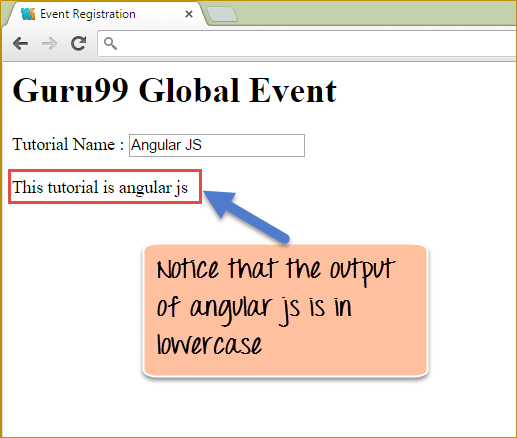 - 可以看出,在 tutorialName 变量中传递的字符串“AngularJS”,它是一个大小写混合的字符,已经被执行。