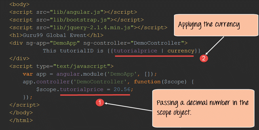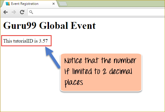 - 我们使用成员变量 tutorialID 并添加过滤器符号 (|) 以及数字过滤器。现在,在 number:2 中,数字 2 表示过滤器应将小数位数限制为 2。