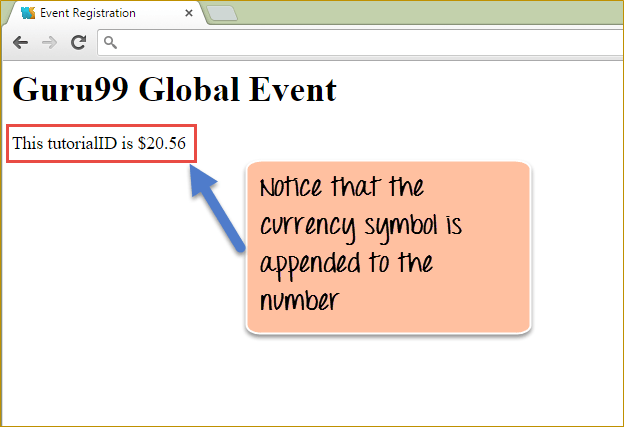 - 可以看到货币符号已追加到变量 tutorialprice 中传递的数字。