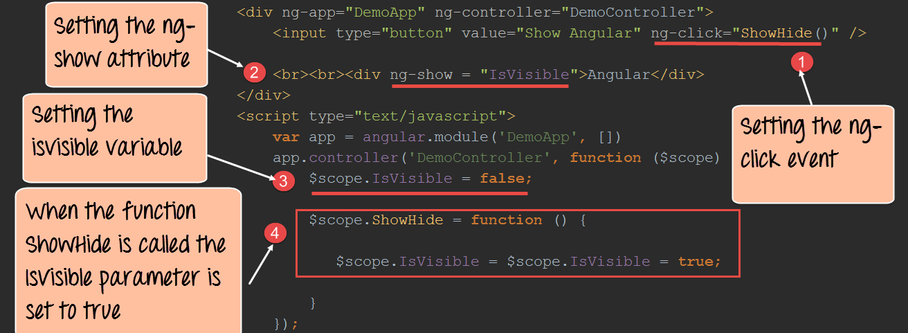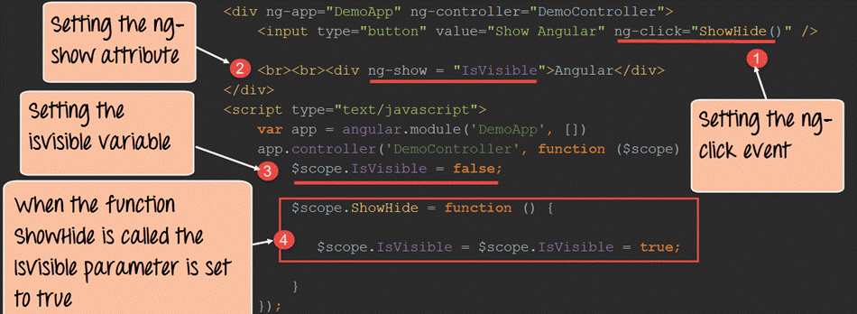 - 我们将 `ng-click` 事件指令附加到按钮元素。在这里,我们引用了在我们的控制器 `DemoController` 中定义的名为 `ShowHide` 的函数。