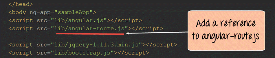 - 下一个重要步骤是从您的应用程序中添加对 ngRoute 模块的依赖。此依赖是必需的,以便可以在应用程序中使用路由功能。如果未添加此依赖项,则无法在 angular.JS 应用程序中使用路由。