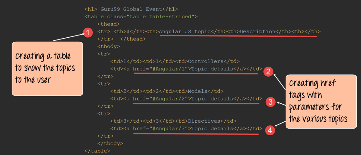 - 为显示“Controllers”主题添加一个表格行。对于此行,将 href 标签更改为“Angular/1”,这意味着当用户点击此主题时,参数 1 将与路由一起传递到 URL 中。