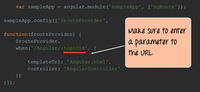 在 routeprovider 服务函数中,添加 :topicId 以表示 URL 中路由之后的任何参数都将被分配给变量 topicId。
