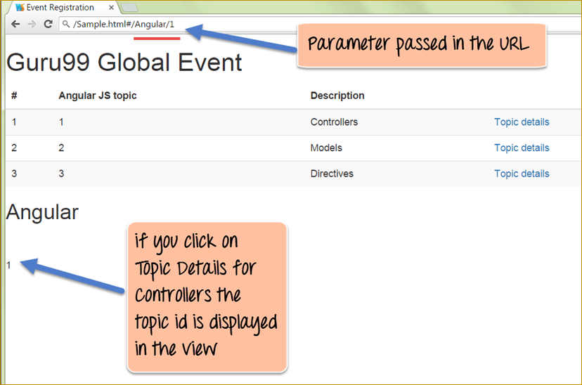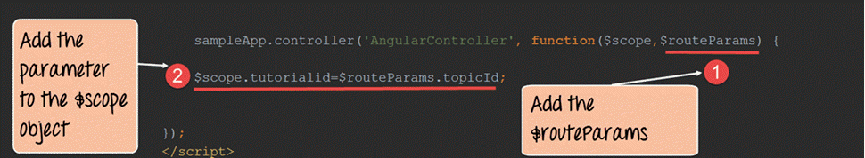 - “routeParams”参数引用了作为路由参数传递的 topicId 对象。我们在这里将‘$routeParams.topicId’变量附加到我们的作用域对象中,作为变量‘$scope.tutotialid’。这样做是为了能够在视图中通过 tutorialid 变量引用它。