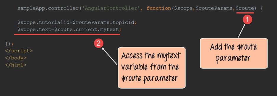 sampleApp.controller('AngularController',function($scope,$routeParams,$route) {