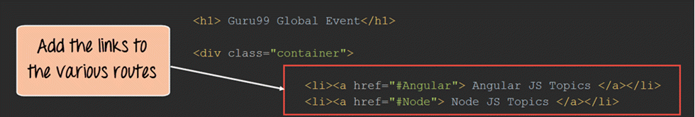 在此页面上,您将托管应用程序的主页面。假设该应用程序正在组织一个活动,并且有人想查看显示的各种活动,或者想查看特定活动的详细信息或删除某个活动。在启用了路由的单页应用程序中,所有这些功能都可以通过以下链接访问: