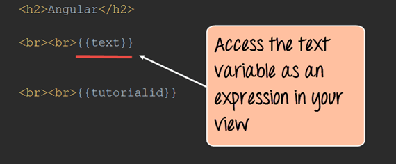 步骤 3) 从作用域对象添加对 text 变量的引用作为表达式。这将添加到我们的 Angular.html 页面中,如下所示。