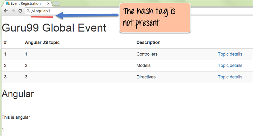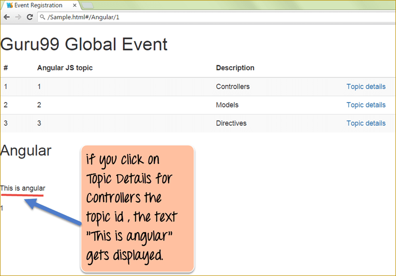 - 当我们在表格中点击任何链接时,我们都可以看到文本“This is angular”也显示出来了。主题 ID 也同时显示出来。