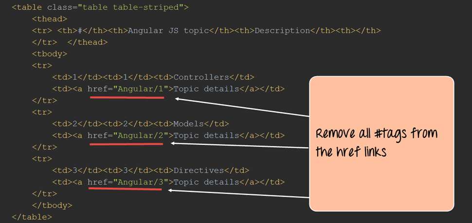 步骤 2) 删除所有链接的 # 标签(‘Angular/1’、‘Angular/2’、‘Angular/3’),以创建易于阅读的 URL。