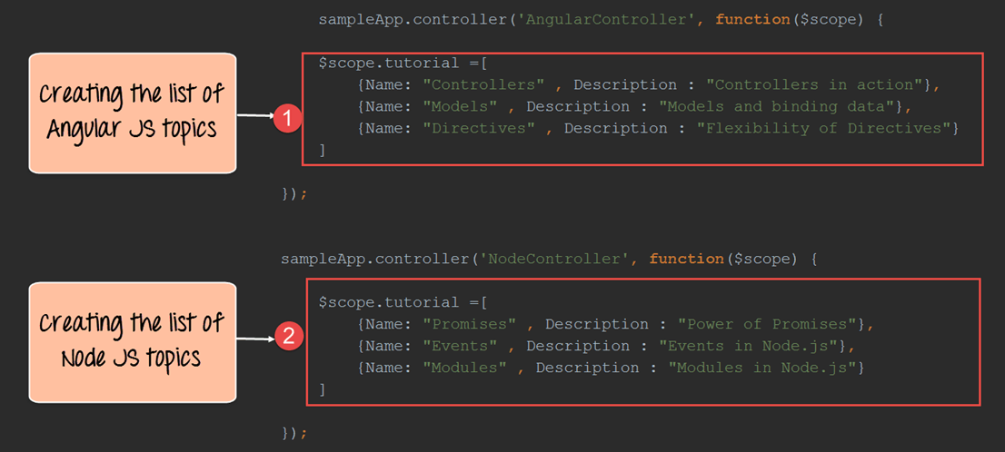 在每个控制器中,我们都创建一个键值对数组来存储每门课程的主题名称和描述。数组变量 ‘tutorial’ 已添加到每个控制器的作用域对象中。