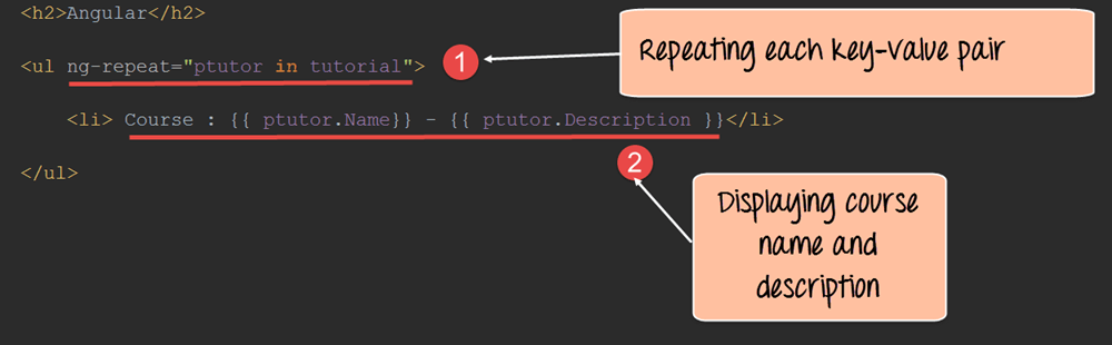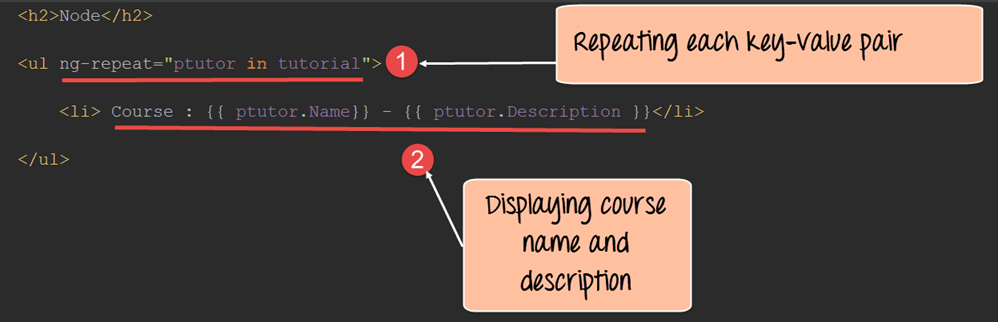 - 使用 ng-repeat 指令遍历 tutorial 变量中定义的每个键值对。