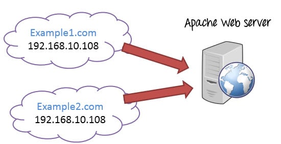 NameVirtualHost *:80 <VirtualHost 192.168.0.108:80> ServerAdmin webmaster@example1.com DocumentRoot /var/www/html/example1.com ServerName www.example1.com </VirtualHost> <VirtualHost 192.168.0.108:80> ServerAdmin admin@example2.com DocumentRoot /var/www/html/example2.com ServerName www.example2.com </VirtualHost>