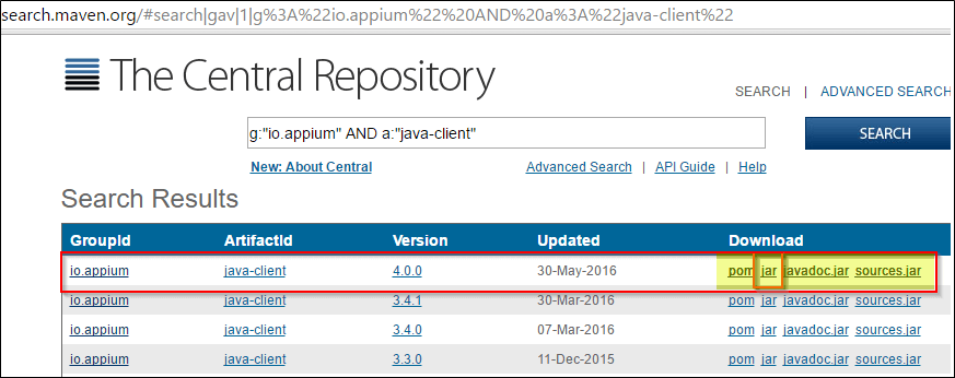 在开始使用 Maven 编写 APPIUM 依赖项测试之前,我们需要从 Maven 中央仓库网站下载 Appium Maven 依赖项(Appium JAR 下载文件)。