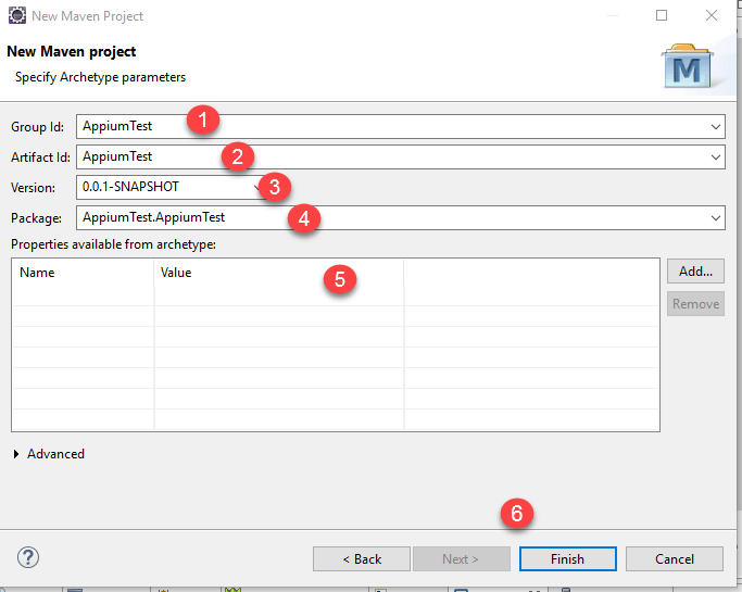 步骤 2) 然后在“新建 Maven 项目”窗口中,在“GroupId”和“ArtifactId”列中输入“Appium Test”。在此步骤中,您必须输入: