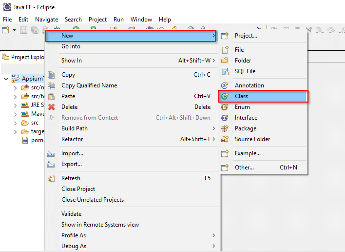 步骤 3) 要开始编写 Appium 脚本。右键单击左侧资源管理器窗口中的“src/main/java”。然后选择“新建”>>“类”。在选定的类中编写 Appium 代码。