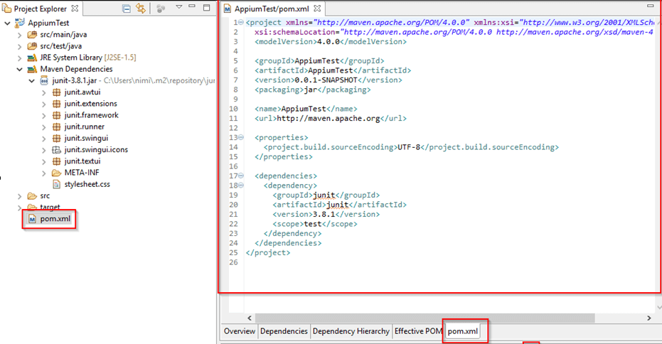 配置 Appium Java Maven 插件 Eclipse 后。它将准备好使用 Appium 和 Maven 测试任何 android .apk 应用程序,如下面的 Appium Maven 项目示例所示。