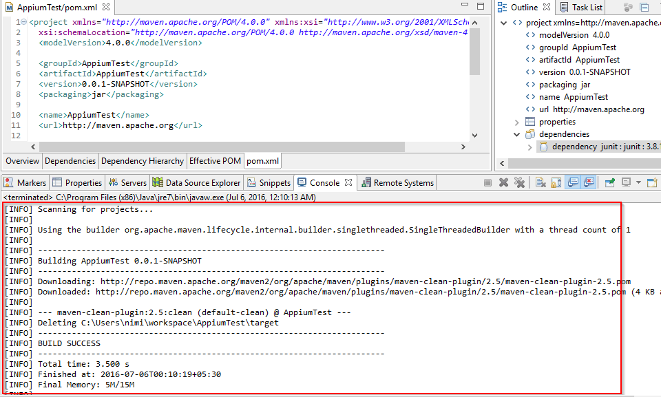 运行时,用户可以看到所有 Maven 相关的 jar 文件和成功消息。因此,用户可以通过这种方式在配置了 Maven 的环境中运行 APPIUM Java 客户端 Maven 依赖项测试。