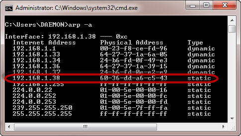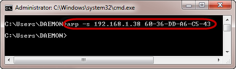 arp –s 192.168.1.38 60-36-DD-A6-C5-43