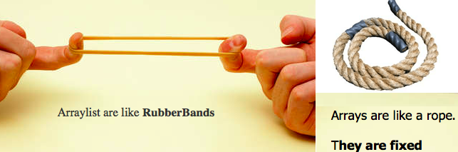 它可以在需要时根据需要增长以容纳它需要存储的元素,并且在移除元素时,它可以收缩到较小的尺寸。所以,就像我们的朋友在使用他无法扩展或缩小的数组时遇到的问题一样,我们将使用 ArrayList。 数组就像上面图片中的绳子;它们有固定长度,既不能扩展也不能减小其原始长度。因此,我们的可伸缩橡皮筋非常类似于 ArrayList,而绳子可以被认为是数组。从技术上讲,ArrayList Java 就像一个动态数组或可变长度数组。