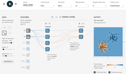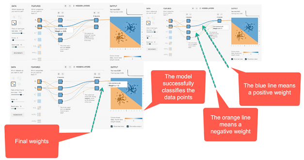 在第二个隐藏层内部,线条的颜色根据权重的符号着色。橙色线条表示负权重,蓝色线条表示正权重。