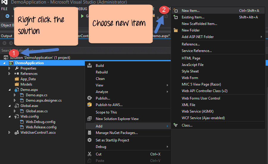 第一步: 确保您正在处理 demo.aspx 文件。必须在此文件中注册 Web 用户控件。这可以通过在 .Net 解决方案的解决方案资源管理器中双击 demo.aspx 文件来完成。