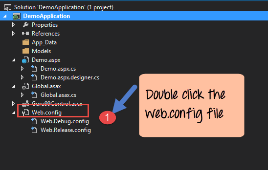 第一步: 通过双击文件,从解决方案资源管理器中打开 web.config 文件。
