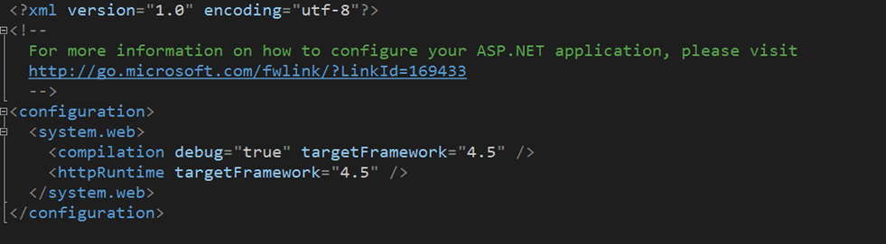打开 web.config 文件时,您可能会看到以下配置。当项目创建时,Visual Studio 会自动添加“web.config”。这是使 ASP.Net 项目正常工作所需的基本配置。