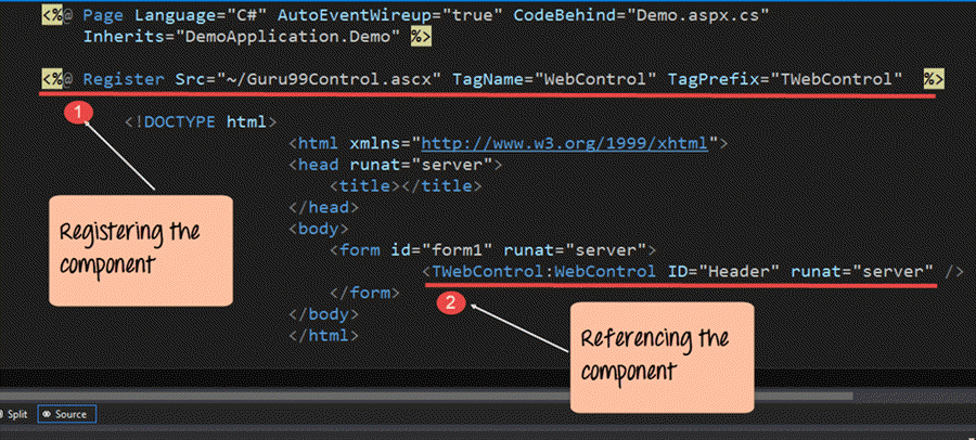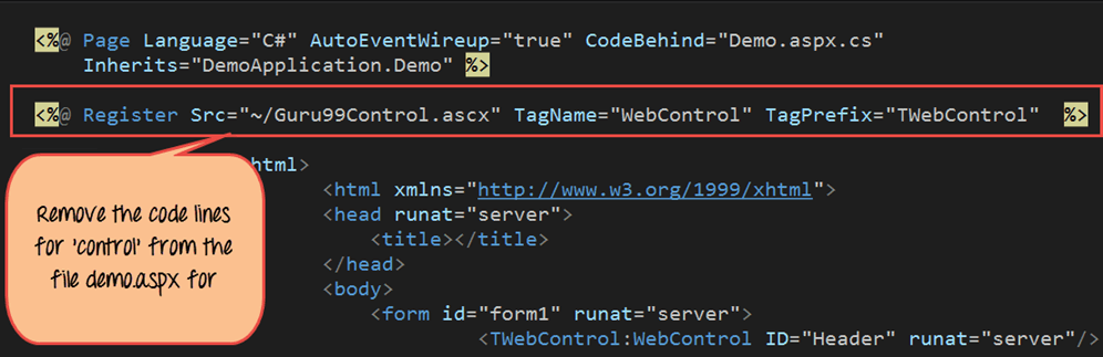 <%@ Page Language="C#" AutoEventWireup="true" CodeBehind="Demo.aspx.cs" Inherits="DemoApplication.Demo" %> <%@ Register Src="~/Guru99Control.ascx" TagName="WebControl" TagPrefix="TWebControl"%> <!DOCTYPE html> <html xmlns="http://www.w3.ore/1999/xhtml"> <head runat="server"> <title></title> </head> <body> <form id="forml" runat="server”> <TWebControl:WebControl ID="Header" runat="server" /> </form> </body> </html>