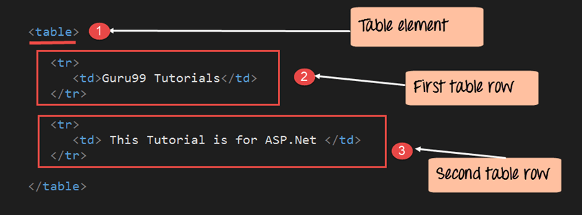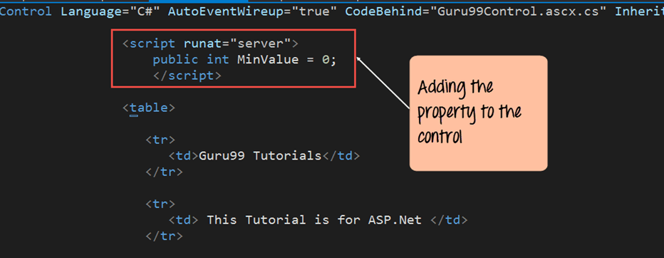 <%@ Page Language="C#" AutoEventWireup="true" CodeBehind="Demo.aspx.cs" Inherits="DemoApplication.Demo" %> <script runat="server"> public int MinValue = 0; </script> <table> <tr> <td>Guru99 Tutorials</td> </tr> <tr> <td> This Tutorial is for </tr> </table>