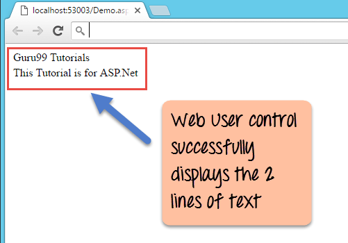<%@ Page Language="C#" AutoEventWireup="true" CodeBehind="Demo.aspx.cs" Inherits="DemoApplication.Demo" %> <%@ Register Src="~/Guru99Control.ascx" TagName="WebControl" TagPrefix="TWebControl"%> <!DOCTYPE html> <html xmlns="http://www.w3.ore/1999/xhtml"> <head runat="server"> <title></title> </head> <body> <form id="form1" runat="server”> <TWebControl:WebControl ID="Header" runat="server" /> </form> </body> </html>