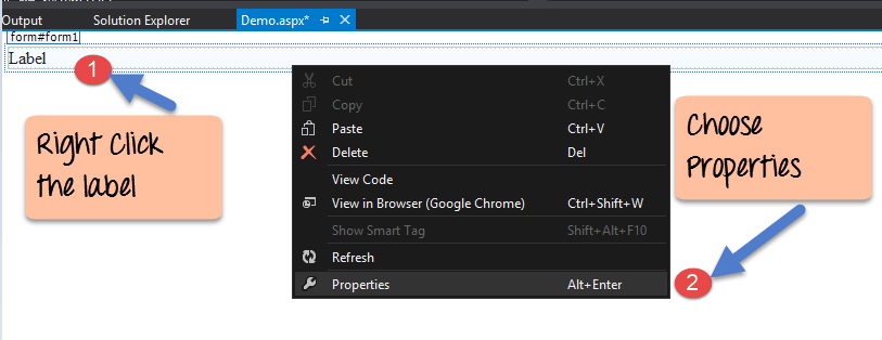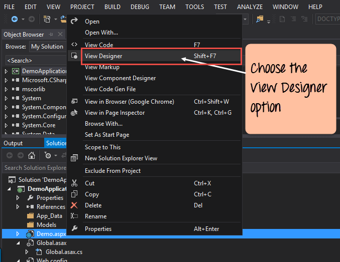 - 在 Solution Explorer 中右键单击 Demo.aspx 文件,然后