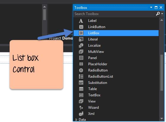 步骤 1) 第一步是从工具箱将 list box 控件拖到 Web Form 上,如下所示。