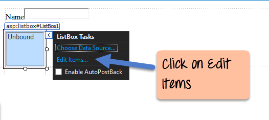步骤 2) 将 listbox 拖到窗体后,会出现一个单独的侧边菜单。在此菜单中选择“Edit Items”菜单。