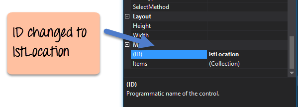 步骤 4) 进入属性窗口,将控件的 ID 属性值更改为 lstLocation。