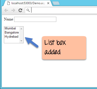 Listbox 用于在 Web Form 上展示项目列表。让我们通过下面的示例了解如何实现这一点。我们将向窗体添加一个列表框来存储一些城市位置。