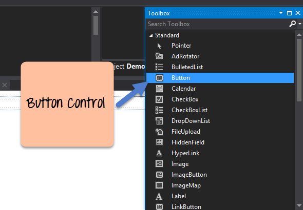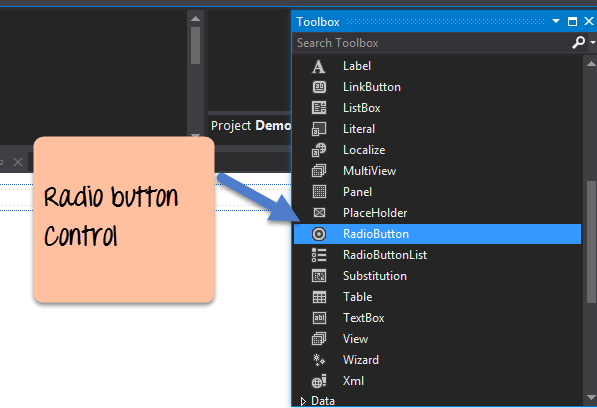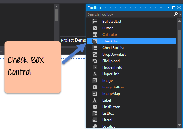 步骤 1) 第一步是打开 Demo Web 窗体的 Forms Designer。完成后,您就可以将控件从工具箱拖放到 Web 窗体上。