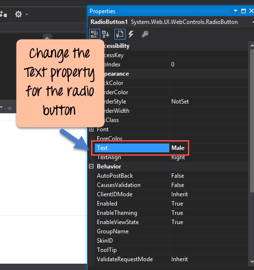 - 同样,将相应控件的 ID 属性更改为 rdMale 和 rdFemale。