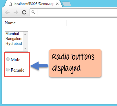 Radio button 用于展示一个项目列表,用户可以从中选择一项。让我们通过下面的示例了解如何实现这一点。我们将为男性/女性选项添加一个单选按钮。