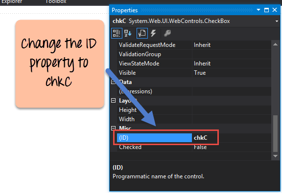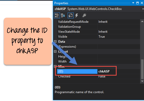 步骤 2) 添加 Checkboxes 后,将 checkbox id 属性更改为“chkASP”。