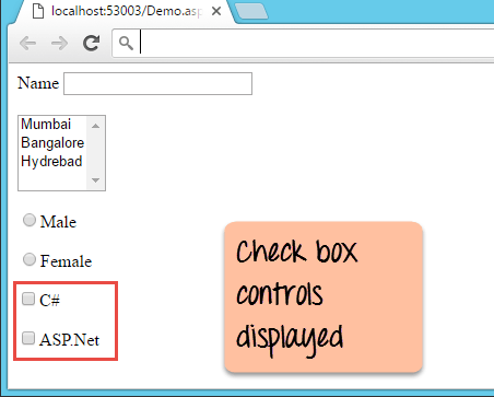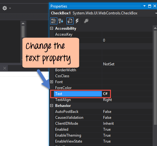 同样,将 Checkbox 控件的 text 属性更改为“C#”。对另一个 Checkbox 控件执行相同的操作,并将其更改为“ASP.Net”。