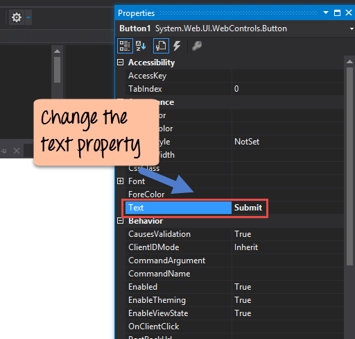 步骤 2) 添加按钮后,通过单击按钮控件进入属性窗口。将按钮控件的 text 属性更改为 Submit。同样,将按钮的 ID 属性更改为“btnSubmit”。